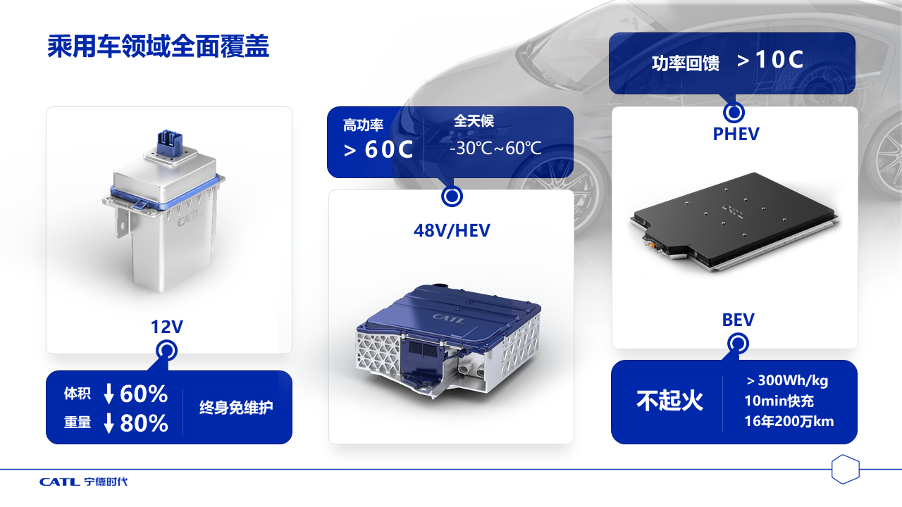 在乘用車領(lǐng)域,我們開發(fā)了12V鋰電池輔助電源,和傳統(tǒng)的鉛酸電池相比重量減少80%、體積減少60%,而且可以終身免維護(hù)。我們開發(fā)的48V和HEV用電池包,可以實(shí)現(xiàn)60C的高倍率放電。開發(fā)的PHEV電池包,可以實(shí)現(xiàn)10C以上倍率的制動(dòng)能量回收。正在開發(fā)的BEV電池包,可以實(shí)現(xiàn)超過1000km續(xù)航、10分鐘的快速充電、16年200萬公里的使用壽命,基本解決消費(fèi)者里程焦慮、充電焦慮和壽命焦慮。